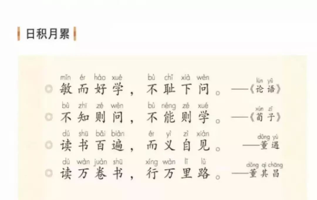 細(xì)心的家長會(huì)發(fā)現(xiàn),小學(xué)一年級(jí)語文教材語文園地里設(shè)有《日積月累》,是要求孩子背誦并測(cè)驗(yàn)?zāi)瑢懙摹_@一欄里經(jīng)常會(huì)出現(xiàn)文言文,一年級(jí)下冊(cè)已經(jīng)要求背誦并理解《論語》選段“敏而好學(xué),不恥下問”了!